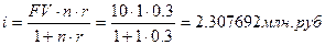 Пример 6. Подлежащая возврату сумма долга — 10 млн руб. Определить сумму начисленных процентов, если срок ссуды 1 год, декурсивная ставка процентов 30% годовых.