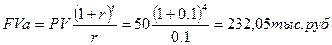 Пример 8. Ежегодно в конце года в течении 4 лет на счет поступают 50 тыс.руб. Определим будущую стоимость, если ежегодно в конце года осуществляется начисление сложных процентов при ставке 10%. Наращенные отдельные платежи представляют геометрическую прогрессию. Тогда будущую стоимость можно определить по формуле:
