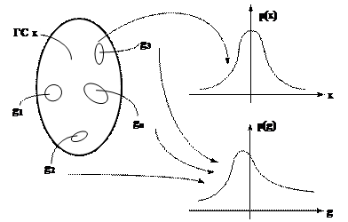 Выборочное распределение – это распределение какой-либо статистики, полученное в результате отбора различных случайных выборок из одной и той же генеральной совокупности и расчета по ним числовых значений этой статистики. На рисунке 10.1 показаны распределение исходной случайной величины х и распределение статистки g, полученное из генеральной совокупности исходной случайной величины х.