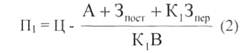 где П - прибыль; Ц - цена единицы продукции; А - амортизационные отчисления; Зпост -другие постоянные затраты; Зпер - переменные затраты; В — выпуск продукции в натуральных единицах. При сокращении производства, измеряемом коэффициентом Кь и при предположении, что цена остается неизменной, формула выглядит следующим образом: