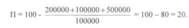Числитель растет еще быстрее, чем во втором случае, издержки еще более увеличиваются. Они могут возрасти до такой степени, что сравняются с ценой или превысят ее. Пример. Предположим, что на фирме производство характеризуется следующими показателями (в условных денежных единицах): Ц=100; Л=200000; ЗПост=500000; 3пер=100 000; Д=10 000 усл. натуральных единиц. Рассчитаем прибыль по формуле (1): При сокращении производства на 30%, т.е. при Ki = 0,7, определим П] по формуле (2):