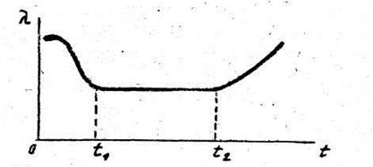 (0 – t1) – период приработки; (t1 – t2) – период нормальной эксплуатации; (t2 – t3) – период старения.