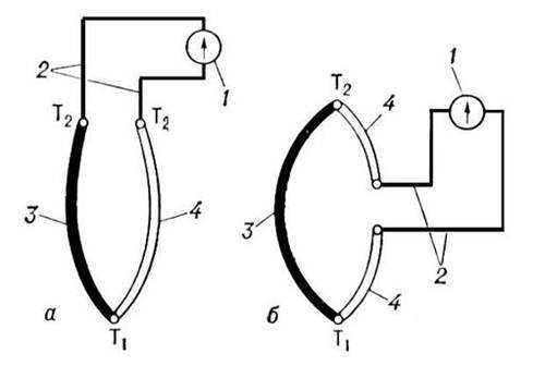 Термоэлектрические преобразователи (термопары) - п ринцип действия термопар основан на термоэлектрическом эффекте, который состоит в том, что при наличии разности температур мест соединений (спаев) двух разнородных металлов или полупроводников в контуре возникает электродвижущая сила, называемая термоэлектродвижущей (сокращенно термо-ЭДС). В определенном интервале температур можно считать, что термо-ЭДС прямо пропорциональна разности температур ΔT = Т1 – Т0 между спаем и концами термопары. Соединенные между собой концы термопары, погружаемые в среду, температура которой измеряется, называют рабочим концом термопары. Концы, которые находятся в окружающей среде, и которые обычно присоединяют проводами к измерительной схеме, называют свободными концами. Температуру этих концов необходимо поддерживать постоянной. При этом условии термо-ЭДС Ет будет зависеть только от температуры T1 рабочего конца. Uвых = Eт = С(Т1 – Т0), где С – коэффициент, зависящий от материала проводников термопары.