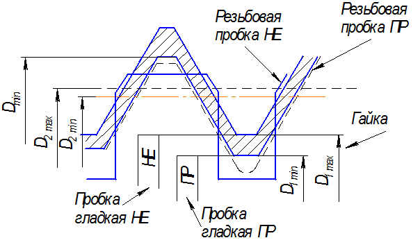 Свинчиваемость ПР калибра с гайкой означает, что приведенный средний D2пр и наружный диаметр резьбы D не выходят за наименьшие предельные значения.