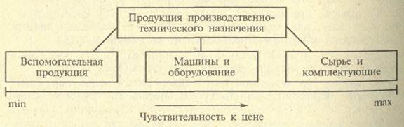 Рис. 14.1. Типы продукции производственно-технического назначения Как видно на рис. 14.1, с точки зрения особенностей ценообразования продукцию производственно-технического назначения можно разделить на два основных класса: 1) товары, приобретаемые однократно. К этой категории относятся элементы основного капитала, т. е. машины, здания, сооружения, оборудование, корабли, самолеты и т.п.; 2) товары, приобретаемые многократно. В эту категорию входят, в свою очередь, товары трех различных групп: а) сырье, т. е. исходное или подвергшееся лишь первичной обработке вещество природы (уголь, нефть, газ, руды металлов и т. п.); б) материалы, т. е. продукция, используемая для изготовления более сложных и комплексных видов товаров либо непосредственно, либо после дополнительной переработки (изоляонные и лесоматериалы, ткани, шарикоподшипники, краснели и лаки, резинотехнические изделия, шерсть, кожа и т. п.); в) комплектующие, т. е. продукция, входящая непосредственно в изделия последующих стадий производства или расходуемая при этом (смазки, масла, шлифовочные пасты и материалы, крепежные изделия, моющие средства, краски и лаки). точки зрения экономического назначения на Родукцию производственно-технического назначения можно глянуть и по-другому. Для этого надо принять во внимание ее роль в обеспечении деятельности фирм-покупателей. С этих позиций мы обнаруживаем, что такая продукция может приобретаться: 1) для непосредственного изготовления на ее основе конечной продукции; 2) для обеспечения условий производственной деятельности' 3) для формирования производственного (физического) капитала. Затраты, связанные с использованием продукции первой категории, непосредственно входят в состав прямых переменных затрат. А потому чувствительность фирм-покупателей к ценам такой продукции наивысшая, так как любое повышение цены покупных ресурсов немедленно порождает рост удельных затрат на выпуск их собственных изделий (рис. 14.2). • Несколько ниже чувствительность покупателей к ценам машин и оборудования, поскольку затраты на их приобретение входят в удельные затраты на изготовление конечной продукции лишь опосредованно — через амортизацию. И наконец, минимальной на данном рынке является чувствительность покупателей к ценам на продукцию производственно-технического назначения, приобретаемую для того, чтобы обеспечить условия для производственной деятельности. Иными словами, спрос на кондиционеры для административных помещений менее эластичен, чем на сырье и комплектующие.