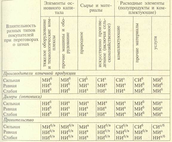 Оценка влиятельности произведена на основе меры влияния цен приобретаемой продукции производственно-технического назначения на затраты в производстве конечных изделий. Примечание. НИ — новое изделие, т.е. продукция, покупаемая для решения новых производственных задач; МИ — модифицированное изделие, т. е. модификация ранее приобретавшейся продукции; СИ — стандартное изделие, продукция, полностью аналогичная приобретавшейся ранее (например, сырье); а — прямые затраты (неизменные в расчете на единицу продукции); - косвенные затраты (меняющиеся в расчете на единицу продукции); в — затраты в соответствии с новым (может быть, еще не утвержденным) бюджетом. Такое многообразие ситуаций порождается не только раз-ичиями между типами покупателей, но и различным их отношением к той или иной категории приобретаемой продукции. - этой точки зрения можно выделить три основные ситуации. 1. Покупка нового изделия (НИ). Это наиболее сложная из задач, решаемых специалистами по закупкам, и сталкиваться с ней приходится в том случае, когда такого рода изделия ранее данной фирмой не приобретались. Это случается при освоении нового вида конечных изделий или при существенном изменении технологии их производства. Оказываясь перед необходимостью решить такую задачу, фирма с хорошо организованной службой закупок действует на основе специальной процедуры выбора оптимального поставщика, что предполагает сбор и тщательное изучение информации: а) о ценах возможных поставщиков (прейскурантов); б) о параметрах предлагаемой ими продукции; в) о репутации этих поставщиков (с точки зрения качества продукции и своевременности поставок); г) о возможностях уторговывания цен (скидках) и т.д. В случае, если выбор оптимального поставщика имеет особенно большое значение (предполагается закупка очень крупной партии или качество и цена покупаемого ресурса могут оказать решающее влияние на конкурентоспособность конечного изделия), данный процесс может предполагать прямое участие высшего руководства фирмы, которое либо устанавливает критерии выбора, либо прямо принимает решение о выборе поставщика по итогам обсуждения информации, предоставляемой отделом закупок. Соответственно продавцы, сталкиваясь с такой ситуацией, должны приложить наибольшие усилия и использовать все инструменты маркетинга, чтобы получить контракт на поставку. 2. Покупка модифицированного изделия (МИ). Такая ситуация менее сложна и более рутинна. Если изделие прежней модификации устраивало покупателя, то есть основания полагать, что он будет склонен обратиться к прежнему поставщику и за новой модификацией. Вместе с тем в этой ситуации все же есть элемент неопределенности: если закупка новой модификации предполагается в больших объемах, то чувствительность покупателя к ценам возрастает. И он может устроить собственный, пусть и не официальный, тендер, т. е. конкурс возможных поставщиков, где основой сравнения будут соотношения «ценность/цена» по продукции различных фирм. При этом, конечно, интенсивность поиска альтернативных поставщиков, равно как и уровень принятия решений о покупке, будет ниже, чем в случае закупки принципиально новой продукции; 3. Покупка стандартного изделия (СИ). Эта ситуация возникает при регулярных поставках стандартной продукции в рамках одной и той же пары «п
