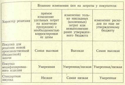 них есть основания полагать, что конкуренты приобретают аналогичные ресурсы по менее высоким (или, во всяком случае не повышающимся) ценам. В этом случае рост цен закупки ресурсов становится фактором прямого снижения конкурентоспособности и потому может вызвать особенно резкую реакцию покупателей; 2) изменение цен закупки ведет к изменению только косвенных или накладных затрат (в табл. 14.1 эта ситуация обозначается верхним индексом «б»). Если рост цены приобретаемого ресурса не влечет столь существенного увеличения затрат, что неизбежным оказывается повышение цены конечного изделия, то покупатель будет куда менее чувствителен к ценам промежуточной продукции; 3) особый вариант — закупки продукции государственными организациями в соответствии с утвержденными бюджетами и нормативами. Логика поведения покупателей из бюрократических структур проста: до тех пор пока предлагаемая потенциальным поставщиком цена (сумма закупки) ниже нормативов утвержденного бюджета, им все равно, сколь она высока по отношению к ценам других альтернативных поставщиков. Иными словами, ниже такой границы чувствительность к ценам со стороны государственных организаций падает. Если же бюджет не утвержден и уровень предельных цен закупок им не задан, то чувствительность государственных покупателей к ценам возрастает (в табл. 14.1 эта ситуация обозначается верхним индексом «в»). Причина тому очевидна: уровень цены закупки начинает влиять на величину расходов по статьям проекта соответствующего бюджета, и потому государственные чиновники вынуждены анализировать цены более пристально. Но на ценовую ситуацию на рынках продукции производственно-технического назначения можно взглянуть и с позиций покупателя. Это даст нам возможность понять, в каких случаях чувствительность покупателя к цене наиболее высока. Если принять в качестве основы классификации описанные выше три уровня сложности решений о покупках и три различных основания для формирования чувствительности к ценам, то мы получим некую матрицу различных ситуаций. Она представлена в табл. 14.2. Как мы видим, покупатель на рынке продукции производственно-технического назначения проявляет наивысшую чувствительность к цене в том случае, когда ему предстоит купить ресурсы: а) которые нужны для решения новой производственной или бюджетной задачи (например, изготовления новой продукции); б) которые прямо влияют на удельные затраты по изготовлению его собственных товаров и их цену; в) которые могут стоит больше, чем будет разрешено в еще не утвержденном бюджете. Рассмотренные выше особенности рынка продукции производственно-технического назначения предопределяют и отличия процессов формирования цен на такую продукцию по сравнению с потребительскими товарами. Эти отличия проявляются через неодинаковое значение одних и тех же факторов при формировании ценовой стратегии. обобщенном виде эти отличия описывает табл. 14.3. Таблица 14.3. Сопоставление факторов формирования ценовой стратегии на рынках потребительских товаров и продукции производственно-технического назначения ф Рынок потребительских Рынок производственно- товаров технической продукции Роль ценовой стратегии в Часто является основным Цена может быть реша- тельского спроса ных случаях может иметь значение меньшее, чем уров