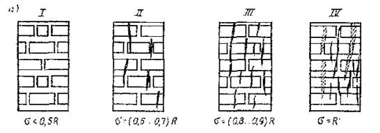 В стадии I кладка работает без повреждений. В стадии II п ри напряжениях 50...70 % прочности кладки. Образуются вертикальные трещины в пределах одного-трех рядов кладки. Эти трещины не опасны, так как при постоянной нагрузке увеличения и раскрытия трещин не происходит. В стадии III при напряжениях 80...90 % прочности кладки вертикальные трещины, развиваясь соединяются друг с другом, расчленяя элемент на отдельные столбики. В стадии IV, при достижении напряжений предела прочности кладки происходит разрушение от потери устойчивости отдельных столбиков, образовавшихся в 3-й стадии.