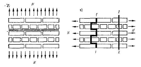 При растяжении и срезе кладка в основном разрушается из-за нарушения сцепления раствора с камнем, поэтому разрушение происходит, как правило, по шву (рис. 4,в). При использовании очень прочных растворов и камня малой прочности может произойти разрушение по камню (рис. 4,г). В зависимости от направления действующего усилия при растяжении, срезе и изгибе каменная кладка может разрушиться по неперевязанному или по перевязанному сечению (рис. 4,г).