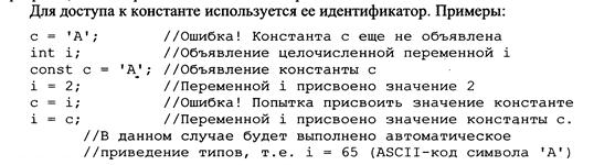 V. Проста змінна, ідентифікатор Для хранения различных данных в языках программирования используют переменные. Переменной называется область памяти, имеющая имя, которое иначе называют идентификатором. Идентификатор - последовательность символов и цифр, служащая для обозначения переменных, новых имен типов и т.п. Допустимыми символами являются: 'A'-'Z', 'a'-'z','_', '0'-'9'. Цифра не может быть первым символом. Идентификатор не может совпадать с ключевым словом или литералами. С одной стороны каждая реализация С++ имеет свой набор ключевых слов, отличающийся в основном расширенными возможностями. С другой стороны не все нововедения в стандарте С++ сразу же поддерживаются разработчиками компиляторов. Ниже приведен примерный список ключевых слов.