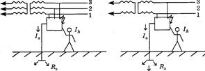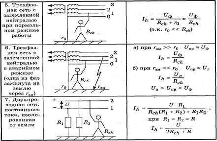 Примечание. В таблице приняты следующие обозначения: U - напряжение источника питания (трансформатора, генератора, выпрямителя и т.п.); R, С - соответственно активное сопротивление и емкость провода сети относительно земли; Rch - полное сопротивление в цепи человека (Rch = Rh + Rоб + Rос, где Rh - сопротивление тела человека, Rоб - сопротивление обуви, Rос - сопротивление основания, на котором стоит человек); Uф - фазное напряжение трехфазной сети; Uл - линейное напряжение трехфазной сети, Uл = При расчете Ih по формулам, приведенным в табл. 2, необходимо знать сопротивление тела человека Rch, которое включает в себя сумму сопротивлений тела человека (Rh), обуви (Rоб) и основания (пола или грунта), на котором стоит человек (Rос). Сопротивление тела человека Rh при напряжении прикосновения Uпр Предельно допустимые значения напряжения прикосновения и токов через тело человека для нормального и аварийного режимов работы электроустановок приведены в табл. 3 - 4. Таблица 3 - Предельно допустимые напряжения прикосновения (UпрПД и токи IhПД, проходящие через человека, при нормальном (неаварийном) режиме работы электроустановки