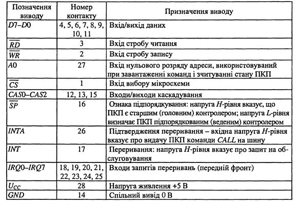 Програмовний контролер переривань КР580ВН59А являє собою при-стрій, що реалізує в МПС обробку запитів переривань від зовнішніх пристроив, як-то датчиків аварійних ситуацій або ПВВ, що реалізують протокол обміну за перериванням (див. підрозд. 6.1, рис. 6.5). ВІС ПКП виконує такі функції: - запам'ятовує запити переривання, які задаються переднім фронтом або потенціалом; - маскує, тобто забороняє виконання обраних запитів; - формує вектор переривання та виконує дії по переходу на підпрог-раму обробки запиту; - формує сигнал переривання для МП; - виконує пріоритетну обробку запитів переривання. Велика інтегральна схема КР580ВН59А залежно від того, як ЇЇ запрог-рамували, може виробляти або код команди 8-розрядного МП /8080 CALL ADRV, де ADRV - адреса підпрограми обробки, або видавати на шину да-них номер переривання п для команди INT n 16-розрядного МП /8086. Одна ВІС ПКП обробляє вісім запитів на переривання, але за каскадного вмикання кількох ВІС кількість запитів переривання може бути збі-льшена до 64. Спрощену структурну схему ПКП показано на рис. 6.62. До складу ПКП входять: - двонапрямлений 8-розрядний буфер даних (BD), призначений для з'еднання ПКП із системною інформаційною шиною; - блок керування читанням/записом (RWCU), що приймає керувальні сигнали від МП і задає режим функціонування ПКП; - схема каскадного буфера-компаратора (СМР), яка використовусться при вмиканні в систему декількох ПКП; - схема керування (CU), що формує сигнали переривання і(або) три-байтову команду CALL або вектор переривання п\ - регістр запитів переривань (RGI), що використовусться для збері-гання всіх запитів переривань; - схема обробки за пріоритетами (PRB), яка ідентифікує пріоритети запитів і вибирає запит із найвищим пріоритетом; - регістр обслуговуваних переривань (ISR), що зберігає рівні запитів переривань, які знаходяться на обслуговуванні ПКП; - регістр маскування переривань {RGM), що забезпечує заборону од-нієї або декількох ліній запитів переривання. Призначення вхідних, вихідних і керувальних сигналів ПКП наведено при описі виводів мікросхеми в табл. 6.20