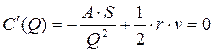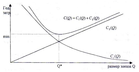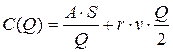 Данная модель известна более 60-70 лет. B такой системе размер заказа является постоянной величиной. И как только уровень наличных запасов уменьшается критического уровня, подается повторный заказ. Эта система основана на выборе размера заказа минимизирующего общие издержки управлении запасами. Общие издержки управления запасами состоят из издержек выполнения заказа и издержек хранения товарных запасов. Издержки выполнения заказа - это накладные расходы, связанные c реализацией заказа. Считается, что эти затраты не зависят от размера заказа (в промышленности - это подготoвительно-заключительные операции). S(ед/год) - интенсивность реализации продукции; Q(ед) - объем партии для одномоментного пополнения товарных запасов; A - затраты, связанные с запуском в производство заказанной партии продукции(в денежных единицах); v - себестоимость единицы продукции (в денежных единицах), r - отдача (в денежных единицах) от каждой денежной единицы, вложенной в товарные запасы. Должна быть принята такая стратегия управления запасами, чтобы обеспечить отдачу в r денежных единиц от каждой вложенной в товарные запасы денежной единицы. Тогда определим издержки выполнения заказа в расчете на единицу продукции заказанной партии A/Q. Для того чтобы определить годовые издержки выполнения заказа необходимо издержки, приходящиёся на единицу товара, умножить на количество товара S, реализованного за год.