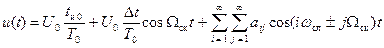 Команды управления ракетой должны быть пропорциональны компонентам смещения ракеты в двух взаимно перпендикулярных плоскостях Если радиолуч создается непрерывным сигналом, то для передачи t и = t и0 + Δ t cosΩск t, (4.13) причем для определенности положим, что время отсчитывается от момента, когда максимум диаграммы направленности антенны занимает крайнее верхнее положение. В состав радиотехнических средств системы теленаведения (системы наведения по лучу) входят РЛС в пункте управления, приемное устройство с СРП и радиовзрыватель на ракете. Структурная схема бортового устройства, применяемого в случае ШИМ зондирующего сигнала, представлена на рис.8. На рис.9 приведены эпюры напряжений в некоторых точках устройства в предположении, что ракета смещена вверх с линии ПУ - цель. Напряжение на выходе детектора модулировано по амплитуде (вследствие смещения ракеты) и длительности (опорным сигналом). Усилительный тракт охвачен петлей автоматической регулировки усиления (АРУ), которая обеспечивает независимость выходных напряжений устройства от дальности ПУ - ракета. Далее устройство разветвляется на два канала: управляющего и опорного напряжения. В первом канале с помощью пикового детектора выделяется огибающая напряжения (4.12), которая подается на фазовые детекторы ФД1 и ФД2. Во втором канале на выходе амплитудного ограничителя выделяется последовательность видеоимпульсов с ШИМ (4.13). Этот сигнал можно представить рядом Фурье