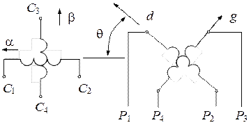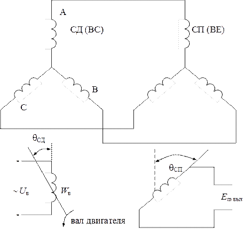 Схема фазовращения Используется для дистанционной передачи угла поворота. Сельсин-датчик связан с осью механизма, угол поворота которой необходимо передать. На оси сельсина-приемника закреплена стрелка, отсчитывающая этот угол поворота (режим индикации). Обе обмотки возбуждения подключены к источнику переменного тока. В сельсинах создается пульсирующее магнитное поле, которое индуцирует в трехфазной обмотке трансформаторные ЭДС. При согласованном положении роторов СД и СП ЭДС равны и соответственно токов в цепях синхронизации и моментов на их осях нет. При повороте ротора СД на некоторый угол q в системе возникает рассогласование углов поворота роторов СД и СП, в трехфазных обмотках появляются уравнительные токи и развивается вращательные моменты на осях сельсинов. Ротор СД жестко соединен с осью механизма, поэтому повернуться не может. Поворачивается только ротор СП и индикаторное устройство на угол, равный возникшему ранее углу рассогласования. Синхронизирующий момент изменяется пропорционально синусу угла рассогласования