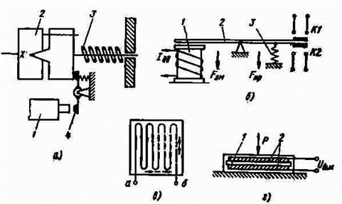 Рис. Схемы силовых датчиков: а – электромеханического; б – токового реле; в – тензометрического; г – пьезоэлектрического