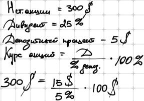 Пример: Номинальная стоимость акции 300$. Вообразим, что эта акция ежегодно приносит дивиденд в 25$. В банке уровень процентной ставки по депозиту/ вкладу 5%. Если исходить из номинальной стоимости акций, то получим: