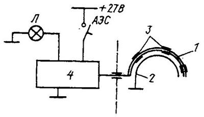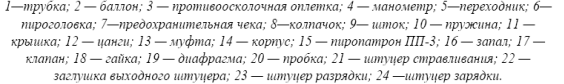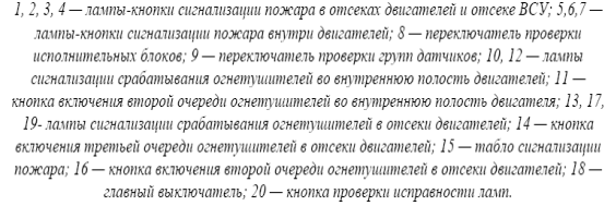 Затвор огнетушителя имеет электрическое дистанционное управление и открывается давлением пороховых газов от специальных пиропатронов. Для повышения надежности на огнетушителе устанавливают по две пироголовки или более, по числу отсеков, в которые из баллона подаётся огнегасящий состав. На пироголовке устанавливается манометр для контроля давления и предохранительная мембрана, которая разрушается при недопустимом превышении давления в результате перегрева (20±0,02мПа). Огнетушители заправляются огнегасящими составами на основе галогенов - брома, фтора (так называемые хладоны). Они вступают в эндотермическую реакцию с продуктами горения. Наиболее распространённым является фреон 114В2. Для выброса состава огнетушитель заряжается воздухом или азотом до давления 10мПа при температуре 20° С. Система сигнализации пожараобеспечивает подачу светового сигнала в кабину экипажа, сигнализирующего о возникновении пожара, и автоматически включает первую очередь огнетушителей. Она включает в себя датчики, исполнительный блок и устройства управления и сигнализации. Датчики системы сигнализации пожара устанавливаются в необходимых количествах в местах наиболее вероятного возникновения пожара с таким расчетом, чтобы они выдавали сигнал не позднее, чем через 3с после возникновения. Сигнал о появлении дыма должен поступать экипажу не более чем через 100с с момента возникновения тления в отсеках. Существуют тепловые, ионизационные, радиационные датчики. Наибольшее распространение получили тепловые и ионизационные датчики. Тепловые - бывают точечные и линейные. Точечные (ДПС-1, ДТБ-2) состоят из нескольких последовательно соединённых термопар, при нагреве которых возникает э.д.с., которая вызывает срабатывание системы. Для подачи сигнала о пожаре необходимо, чтобы температура вокруг датчика была 150° C и скорость нарастания ее 2°C/с. Подача сигнала о пожаре прекращается при снижении температуры вокруг датчика ниже 130° С. Линейные датчики имеют различную конструкцию и размеры. Они способны охватывать большие объемы отсеков. Чувствительные элементы могут быть выполнены в виде трубки, заполненной полупроводниковым заполнителем. Внутри трубки проходят электрический проводник, по которому пропускается ток, и минусовой провод. В качестве последнего может быть использована сама трубка. При нормальной температуре сопротивление заполнителя велико, а при нагреве оно понижается и между электродами замыкается цепь и выдаётся сигнал. Ионизационный датчик (ИС) срабатывает в результате ионизации продуктов горения и появления при этом электропроводности между двумя электродами. Как правило, одним из них является корпус авиадвигателя или планер ВС. Время срабатывания при этом не превышает 1-2с. Недостаток данного типа датчиков в возможности ложного срабатывания.