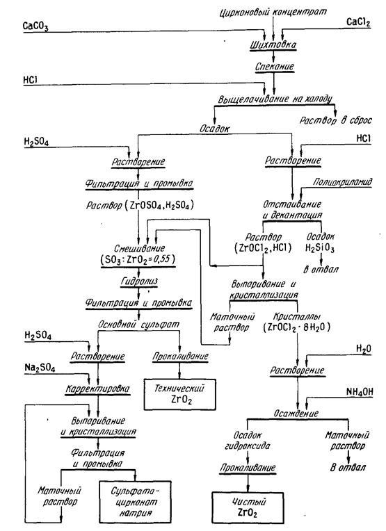 Технологическая схема переработки цирконового концентрата по способу спекания с карбонатом кальция.
