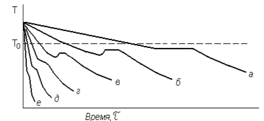 Рис. 2.7. Термические кривые кристаллизации при различных скоростях охлаждения: от а до е – увеличение скорости охлаждения системы. Кинетика кристаллизации при разных степенях переохлаждения различается. Это можно видеть из кривых изменения свободной энергии системы: при ΔТ2 > ΔТ1 (рис. 2.4), когда f2 > f1 и, следовательно, отрицательный член суммарной свободной энергии системы значительно возрастает по абсолютной величине, уменьшая уровень энергии, который необходимо преодолеть для образования критического зародыша, и саму величину критического зародыша (индексы 1 и 2 на рис. 2.6). Совершенно очевидно, что чем меньше критический размер зародыша, тем большее число частиц сумеют преодолеть критический энергетический барьер и стать зародышами критических размеров.