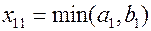 Таким образом, математическая постановка данной транспортной задачи состоит в нахождении такого неотрицательного решения системы линейных уравнений (1), при котором целевая функция (2) принимает минимальное значение. 1. Метод «северо-западного угла» угла. Шаг 1. Составляют транспортную таблицу. Шаг 2. Транспортную таблицу начинают заполнять с левого верхнего (северо-западного) угла. При заполнении двигаются по строке вправо и по столбцу вниз. В клетку, находящуюся на пересечении первой строки и первого столбца, помещается максимально возможное число единиц продукции, разрешённое ограничениями на предложение и спрос: Замечание. На некотором шаге (но не на последнем) может оказаться, что потребности очередного пункта назначения равны запасам очередного пункта отправления. В этом случае также временно исключают из рассмотрения либо столбец, либо строку (что-нибудь одно). Таким образом, либо запасы соответствующего пункта отправления, либо потребности данного пункта назначения считаются равными нулю. Определим начальное решение по методу «северо-западного» угла в транспортной задаче из примера 1. Транспортная таблица имеет следующий вид: