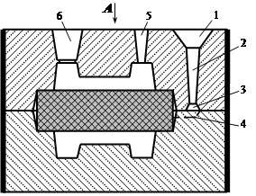 Литейные стержни изготавливают с помощью стержневых ящиков (рис. 3.1- в), в которых производят формовку специальной стержневой смеси, основой которой является кварцевый песок с различным связующим (например, синтетической смолой или жидким стеклом). В процессе изготовления стержня внутри него металлической иглой обычно делают вентиляционный канал 5 (рис. 3.3), служащий для лучшего удаления газов, образующихся при контакте с расплавленным металлом в процессе литья. Стержни сложной формы могут состоять из двух и более частей (рис. 3.4), которые могут как предварительно склеиваться друг с другом, так и вставляться одна в другую в процессе сборки литейной формы. Литниковая система – это система каналов и резервуаров для подвода расплавленного металла в полость литейной формы, её заполнения и питания отливки при затвердевании. Литниковая система должна обеспечивать заполнение литейной формы с необходимой скоростью, задержку шлака и других неметаллических включений, выход паров и газов из полости формы, непрерывную подачу металла к твердеющей отливке. После окончания литья избыточный металл, заполняющий литниковую систему, застывает, сохраняя форму её каналов (рис. 3.1- о) и образуя отход, подлежащий отделению от самой отливки. Основными элементами литниковой системы (рис. 3.5) являются: 1 – литниковая чаша (воронка), которая предназначена для приёма струи расплава, вытекающей из разливочного ковша, и частичного задержания попадающего вместе с расплавом шлака; 2 – стояк – вертикальный или наклонный канал, передающий расплав из литниковой чаши внутрь литниковой системы; 3 – шлакоуловитель – горизонтальный канал, расположенный, как правило, в верхней полуформе и служащий для задержания шлака и передачи расплава из стояка к питателям; 4 – питатель – канал, подающий расплав непосредственно в полость литейной формы (питатель может быть как один, так и несколько, и они обычно располагаются в нижней полуформе); 5 – выпор – вертикальный канал для вывода газов из полости формы, сигнализации об окончании заливки, питания отливки расплавом при затвердевании; 6 – прибыль – резервуар с расплавленным металлом, обеспечивающий его непрерывный подвод к массивной части отливки, застывающей последней (при наличии нескольких массивных частей прибылей также может быть несколько); 7 – коллектор – распределительный горизонтальный канал, иногда выполняемый между шлакоуловителем и питателями для одновременного направления расплава к различным частям полости литейной формы.
