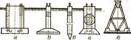 Элементы опор. В последние годы ведутся экспериментальные работы по выполнению траверс или верхней части — «головки» опоры — из синтетических материалов — стеклопластика, эпоксидных и полуэфирных смол. При соответствующей конструкции этих частей может отпасть необходимость в линейных изоляторах, функции которых в этих случаях выполняют траверсы или детали головки опоры. Эти синтетические материалы обеспечивают и механическую прочность, необходимую для деталей опор. Их достоинствами являются простота изготовления (отливки) и неподверженность окислению и коррозии. Устойчивость вертикального положения опор обеспечивается заглублением в грунте нижней части стоек опор (железобетонные, реже — деревянные) и таким же заглублением пасынков, составляющих продолжение стоек, или креплением стоек к специальным подземным фундаментам. Обычная глубина заложения в грунт фундаментов или заглубления стоек составляет 2,5—3,0 м, Имеется большое количество фундаментов, различных по типу, конструктивным формам и материалу. Их выбор производится на основании комплексных технико-экономических соображений в зависимости от типа и конструкции опор, от характера грунта, степени механизации работ по сооружению линии и др. На рис. 1-24 представлены наиболее распространенные типы фундаментов для закрепления металлических опор в грунте: а — монолитный бетонный с анкерными болтами; б — железобетонный грибовидный; в — железобетонная свая; г — набивной бетонный с анкерными болтами; д — металлический подножник. В настоящее время монолитные бетонные фундаменты выполняются относительно редко. Наиболее широко применяемыми являются железобетонные подножники, сваи различных конструкций и набивные фундаменты. Тросы опор на растяжках и оттяжках прикрепляются к специальным анкерным плитам.