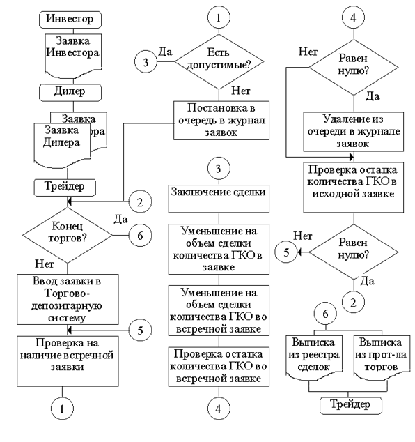 Рисунок 7.7. Процедура обращения ГКО на вторичном рынке. Введенная и принятая Торгово-депозитарной системой заявка проверяется на наличие допустимых встречных заявок. Встречные заявки находятся в централизованном журнале заявок и имеют противоположную направленность исходной заявке. Например, если введенная исходная заявка на покупку конкретных ГКО, то встречная заявка будет на продажу этих же ГКО. Журнал заявок открыт для всех Трейдеров и перед началом торгов является пустым. Для заключения сделки встречная заявка должна быть допустимой. Допустимыми встречными заявками называются встречные заявки с ценами, не большими (или не меньшими при продаже), чем цена, указанная в исходной заявке. Обнаружив допустимую встречную заявку, в качестве которой выбирается стоящая первой в очереди журнала заявок, система оформляет заключение сделки. При этом выполняется ряд действий по следующему алгоритму. Уменьшается на объем сделки количество ГКО в поданной заявке и в допустимой встречной заявке. Если полученный таким образом остаток допустимой встречной заявки равен нулю, то она удаляется из журнала заявок. Если получился остаток во введенной исходной заявке, то описанные этапы поиска повторяются снова до тех пор, пока либо поданная заявка не будет исполнена полностью, либо не останется ни одной допустимой встречной заявки. Полученный остаток в исходной заявке после описанной процедуры поиска допустимых встречных заявок служит основанием постановки ее в очередь в журнал заявок. При этом учитывается цена и время подачи заявки. Первой в очереди на покупку является заявка с максимальной ценой, а в очереди на продажу - заявка с минимальной ценой. При равенстве цен в заявках одинаковой направленности приоритет имеет заявка, поданная ранее. В ходе торгов Трейдеры получают на экранах своих терминалов в режиме реального времени следующую информацию: