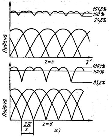 где Из выражения суммарной мгновенной подачи всех поршней ( Т.к. по окружности блока цилиндров расположено z поршней, то образуется z сдвинутых по фазе На рис. 4 приведены расчетные графики колебания подачи жидкости с числом цилиндров z = 5 и z = 6 в функции угла