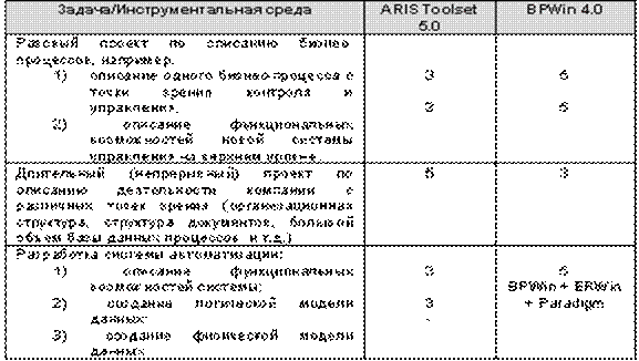 Различные ситуации применения инструментальных средств моделирования бизнес-процессов и их экспертная оценка по 5-бальной шкале показаны в следующей таблице 4.