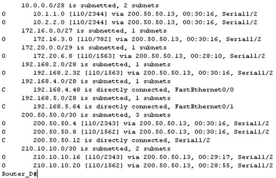 Router_D(config)# router ospf 1 Router_D(config-router)# network 192.168.4.48 0.0.0.15 area 0 Router_D(config-router)# network 192.168.5.64 0.0.0.15 area 0 Router_D(config-router)# network 200.50.50.12 0.0.0.3 area 0