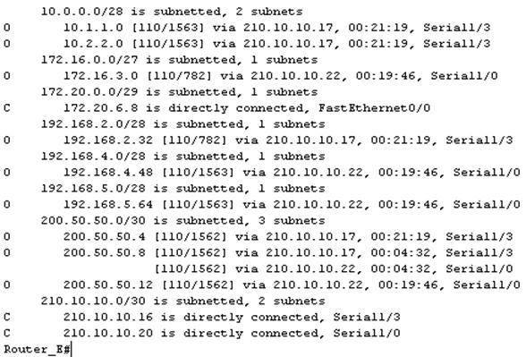 Router_E(config)# router ospf 1 Router_E(config-router)# network 172.20.6.8 0.0.0.7 area 0 Router_E(config-router)# network 210.10.10.16 0.0.0.3 area 0 Router_E(config-router)# network 210.10.10.20 0.0.0.3 area 0
