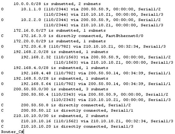 Router_C(config)# router ospf 1 Router_C(config-router)# network 172.16.3.0 0.0.0.31 area 0 Router_C(config-router)# network 200.50.50.8 0.0.0.3 area 0 Router_C(config-router)# network 200.50.50.12 0.0.0.3 area 0 Router_C(config-router)# network 210.10.10.20 0.0.0.3 area 0
