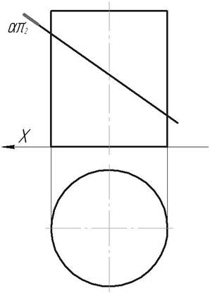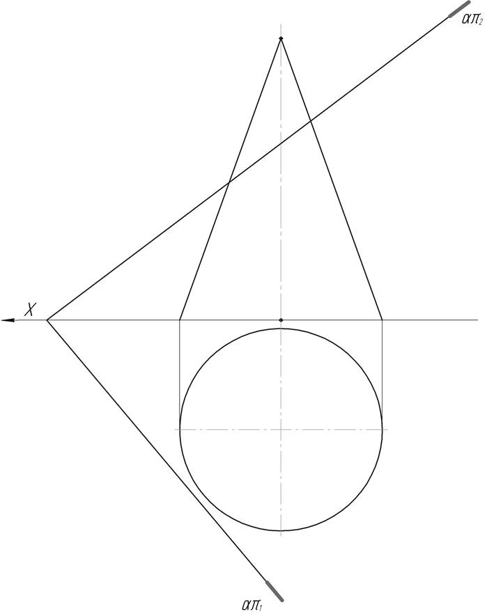 Пересечение конуса с плоскостью общего положения Решаем при помощи посредников 1. Определяем положения большой оси эллипса, она располагается по линии ската секущей плоскости α. Для этого введём вспомогательную плоскость-посредник β, которая рассечёт конус по треугольнику, т.к. проходит через вершину, а плоскость α по линии ската ⊥ горизонтальному следу.__ _________________________________________________________________________________________ 2. Определяем положение малой оси эллипса. Она расположена ⊥ большой оси и проходим через её середину. Для её нахождения используется плоскость-посредник γ (гориз. проец.). Она рассекает конус по треугольнику, а плоскость α по горизонтали. На пересечении треугольника и горизонтали на π2 определяем крайние точки малой оси._________________________________________________________ _________________________________________________________________________________________ 3. Определяем дополнительно характерные точки изменения видимости эллипса. Они расположены на очерковых образующих конуса. Для их нахождения на π2 используем вспомогательную плоскость δ (фронтальная плоскость уровня.__________________________________________________ _________________________________________________________________________________________ 4. Соединяем полученные точки по лекало. Построение линии сечения начинается с определения опорных точек – наивысшая и наинисшая точки. т. 1 и 2 и характерных точек – изменение видимости, кривизны и др._____________________________________________________________________________ _________________________________________________________________________________________ 5. Находим натуральную величину фигуры сечения способом совмещения.______________________ _________________________________________________________________________________________ 6. Для построения развёртки усечённой части конуса необходимо вписать в него пирамиду и строить развёртку пирамиды способом триангуляции.__________________________________________ _________________________________________________________________________________________