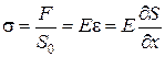 Для определения скорости упругих волн в упругой среде рассмотрим продольную плоскую волну, распространяющуюся в направлении оси 0 х. Выделим в среде цилиндрический объем с площадью основания S 0 и высотой dx. Смещения S частиц с разными х в каждый момент времени оказываются различными. Если основание цилиндра с координатой х имеет в некоторый момент времени смещение S, то смещение основания с координатой x + dx будет S + dS. Тогда, рассматриваемый объем деформируется и получает удлинение dS или относительную деформацию e = ¶ S /¶ x (деформации растяжения). Наличие деформации свидетельствует о существовании нормального напряжения s, которое при малых деформациях пропорционального величине деформации. По закону Гука для деформации растяжения − сжатия