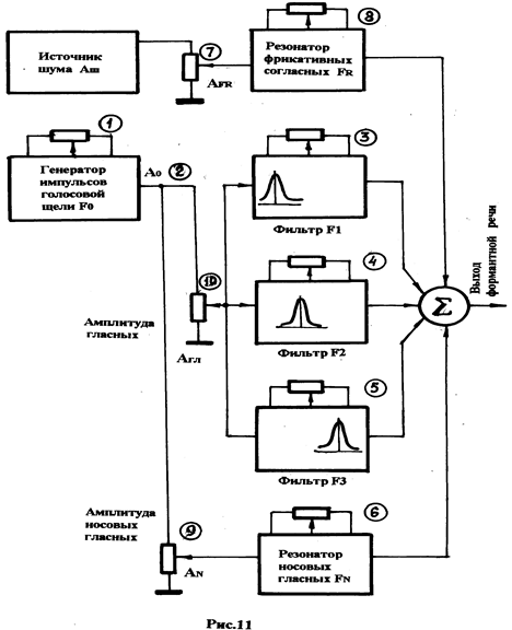 На рисунке с помощью потенциометров, подключённым к отдельным блокам модели, задаются параметры, управляющие синтезом речи. В указанной схеме используются 10 таких параметров. Такую модель несложно реализовать, но практически она будет неработоспособна, так как задание параметров с помощью потенциометров приводит к чрезвычайно большому времени синтеза.