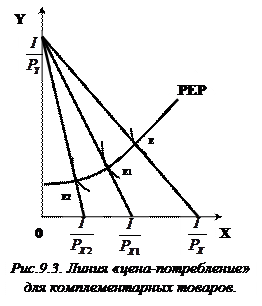 Если товарный набор представлен товарами-субститутами, то линия «цена – потребление» имеет отрицательный наклон. При росте цены Рх возрастает потребление товара у (рис. 9.2). Для товаров – дополнителей (комплементарных) при росте Рх потребление товара у сокращается. Линия «цена — потребление» для этих товаров имеет положительный наклон (рис. 9.3).