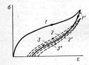 Рис. 7.2 – Изменение петли гистерезиса при многократных деформациях полимера 1 – 1' –сокращение в первом цикле деформирования; 2 – 2' – то же во втором цикле; 3 – 3' – то же в третьем цикле