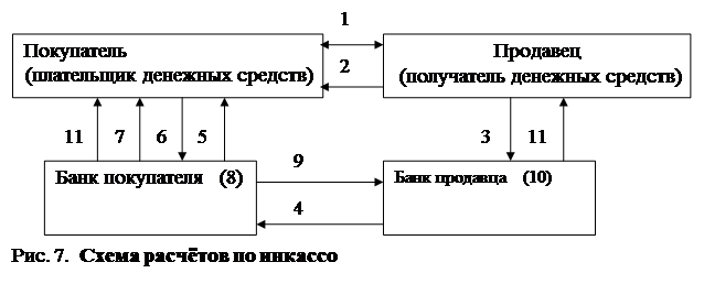 5) Инкассо – это банковская операция, посредством которой банк по поручению своего клиента получает на основании расчётных документов причитающиеся ему денежные средства за отгруженный товар и зачисляет их на счёт своего клиента. Схема расчётов по инкассо (рис. 7) осуществляется согласно банковским правилам.