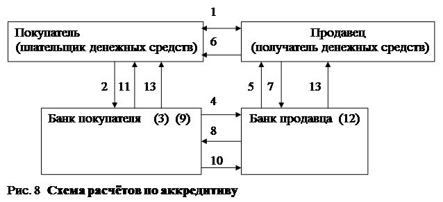 Где: 1 – заключение договора о поставке товара; 2 – покупатель даёт поручение на открытие аккредитива; 3 – открытие аккредитива; 4, 5 – уведомление об открытие аккредитива; 6 – отправка товара; 7 – передача отгрузочных документов; 8 – пересылка документов; 9 – снятие со счёта денежных средств, для оплаты документов; 10 – перечисление денежных средств; 11 – передача документов покупателю; 12 – зачисление на счёт денежных средств; 13 – выписка о состоянии счёта.