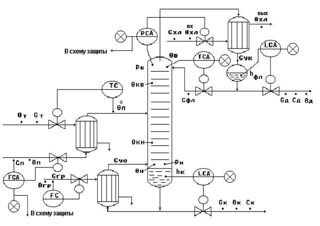 1. Регулирование. Регулирование θв=f(cд) по подаче флегмы - косвенное регулирование показателя эффективности процесса cд. Регулирование Pв по подаче хладоагента Gхл - обеспечивает материальный баланс по паровой фазе. Регулирование hфл по отбору флегмы Gфл - обеспечивает материальный баланс по жидкой фазе верха колонны. Регулирование hк по отбору кубового продукта Gк - обеспечивает материальный баланс по жидкой фазе низа колонны. Стабилизация расхода питания Gп - обеспечивает: - материальный баланс по всему веществу, - снятие наиболее существенных возмущений, - заданное положение рабочей области колонны; - стабилизацию производительности установки. Стабилизация расхода греющего пара Gгр - обеспечивает: - тепловой баланс установки; - стабилизацию Gy0. Регулирование θ п0 по подаче Gт обеспечивает: - заданное положение рабочей линии; - эффективность процесса разделения; - тепловой баланс 2. Контроль. Температуры и расходы всех исходных потоков. Температуры - θв, θн, θкв, θкн, θп0. Давление - Рв, Рн. Уровень - hфл, hк. Концентрации - сд или ск. 3. Сигнализация. существенные отклонения hфл, hк, θв от заданий: повышение резкое снижение или прекращение подачи потока питания Вопросы для самоконтроля: