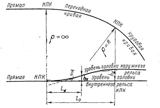 Длину переходной кривой l0. определяют по нескольким критериям, основным из которых является плавный отвод возвышения наружного рельса с установленным уклоном i. В России при скоростях до 120 км/ч i = 0.001