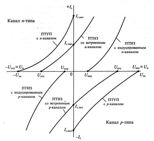 Из рассмотренного ранее следует, что всего существует шесть типов полевых транзисторов. Их типовые передаточные характеристики приведены на рисунке 6. Пользуясь этими характеристиками, можно установить полярность управляющего напряжения, направление тока в канале и диапазон изменения управляющего напряжения. Из всех приведенных разновидностей транзисторов в настоящее время не выпускаются только ПТИЗ со встроенным каналом р -типа. Рассмотрим некоторые особенности этих характеристик. Все характеристики полевых транзисторов с каналом п -типа расположены в верхней половине графика и, следовательно, имеют положительный ток, что соответствует положительному напряжению на стоке. Наоборот, все характеристики приборов с каналом р -типа расположены в нижней половине графика и, следовательно, имеют отрицательное значение тока и отрицательное напряжение на стоке. Характеристики ПТУП при нулевом напряжении на затворе имеют максимальное значение тока, которое называется начальным IС нач. При увеличении запирающего напряжения ток стока уменьшается и при напряжении отсечки Uотс становится близким к нулю.