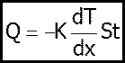 Теплота, що переноситься за час t через поверхню площею S прямо пропорцiйна градiєнту температури К - коефiцiєнт теплопровiдностi. Фiзичний змiст К: К чисельно дорiвнює кiлькостi теплоти Q, яка переноситься за одиницю часу через одиничну поверхню при одиничному градiєнтi температури Знак "- " указує на: 1). математично: перенос маси, iмпульсу та енергiї вiдбувається у напрямку зменшення градiєнтiв густини, швидкості та температури; 2). фiзично: термодинамічна система переходить iз неврiвноваженого стану в рiвноважний тiльки таким чином, а не iнакше.