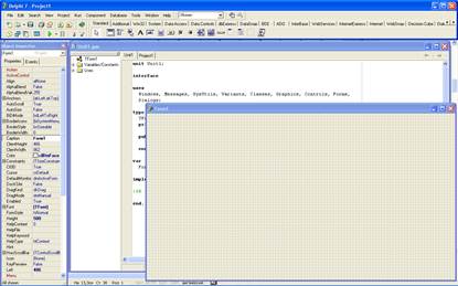 Рис. 2. Структура проекта в Delphi Проект — это вся совокупность файлов, из которых Delphi создает приложение. Один проект соответствует одному приложению. В состав проекта Delphi обязательно входят следующие элементы: · Файл проекта (его расширение.DPR). Это программный код на языке Object Pascal, который генерируется автоматически и содержит ссылки на все модули проекта и инициализирует приложение. При создании нового проекта файл содержит следующие строки: program Project1; uses Forms, Unit1 in 'Unit1.pas' {Form1}; {$R *.RES} begin Application.Initialize; Application.CreateForm(TForm1, Form1); Application.Run; end. · Файлы всех модулей, входящих в проект (*.PAS). Любая форма из состава проекта обязательно имеет свой модуль, однако, обратное утверждение не всегда верно, и могут существовать чисто программные модули. В каждом модуле может содержаться только одна форма. При создании новой формы генерируется текст файла Unit1.pas. · Значения свойств формы и ее компонентов сохраняются в файле ресурсов *.DFM. · Файл ресурсов приложения (*.RES). В него входят ресурсы, не вошедшие в формы, например, значок приложения, который будет виден при его свертывании. · Файл параметров проекта (*.DOF). Все параметры среды разработчика ориентированы на проект и могут быть сохранены и затем восстановлены при загрузке этого проекта. · В Delphi 4 добавлен еще один файл - файл конфигурации проекта с расширением *.CFG. · При компиляции проекта и отдельных модулей создаются бинарные файлы *.EXE и *.DCU. Так как проект состоит из большого количества файлов, то рекомендуется для каждого проекта создавать свой каталог. Новый проект: File/New/Other