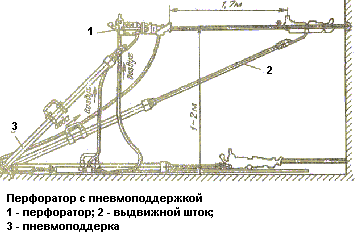Производительность бурения шпуров ручными электросверлами (м/ч) в породах с коэффициентом крепости f =2—5 Для бурения шпуров диаметром 32—46 мм и глубиной до 5 м по породам с коэффициентом крепости />5 применяют переносные (ручные) перфораторы — бурильные машины ударно-поворотного бурения, работающие на сжатом воздухе. Ручные перфораторы ПП-36В, ПП-54В1. ПП-63В и ПП-63ВБ расходуют 2,8—3,8 м/мин сжатого воздуха, развивают энергию удара до 63 Дж и имеют массу 24—35 кг. Если сверло или перфоратор устанавливают на распорной колонке, то его называют колонковым. Колонковые перфораторы ПК-60А, ПК-75А применяют для бурения шпуров и