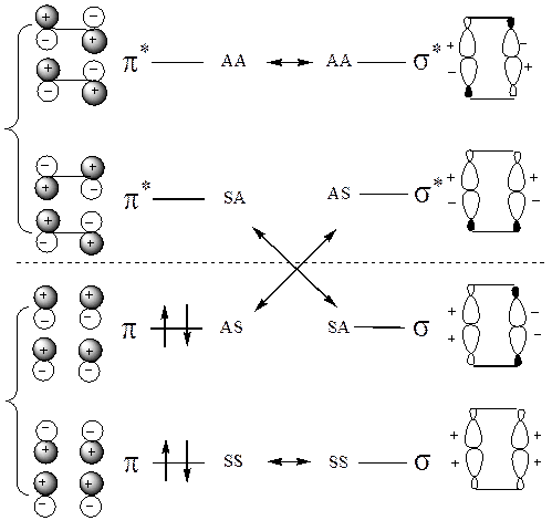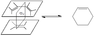 Сначала здесь также нужно установить элемент симметрии, который сохраняется в течении всего процесса. При димеризации этилена в качестве таких элементов используют две плоскости симметрии συ и σh, причем συ относится к симметрии системы С=С (двойной связи), а σh – к симметрии между обеими присоединяющими молекулами.