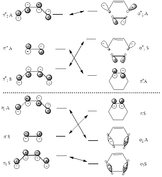 Соответствующая корреляционная диаграмма показывает, что разрешена термическая реакция. Это согласуется с экспериментальными данными по реакции Дильса-Альдера.