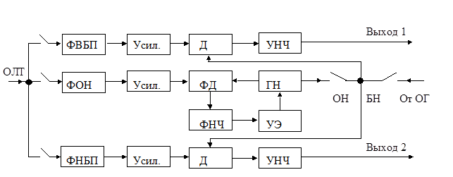 Рис.6.19 Структурная схема приемника сигналов ОБП с неполностью и полностью подавленной несущей ОЛТ - общий линейный тракт; ФВБП (ФНБП) -фильтр верхней (нижней боковой полосы); ФОН - фильтр остаточной несущей; Д -демодулятор сигналов боковых полос; УЭ - управляющий элемент БН - без несущей; ОГ - опорный (высокостабильный) генератор.