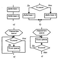 Приведем запись алгоритма нахождения минимального числа М в последовательности из п чисел a1, а2,..., ап (п ¹ 0) в виде блок-схемы (рис. 1). Базовые структуры алгоритмов — это определенный набор блоков и стандартных способов их соединения для выполнения типичных последовательностей действий. К основным структурам относятся следующие: линейные (рис. 2, а), разветвляющиеся (рис. 2, б), циклические (рис. 2, в, г).